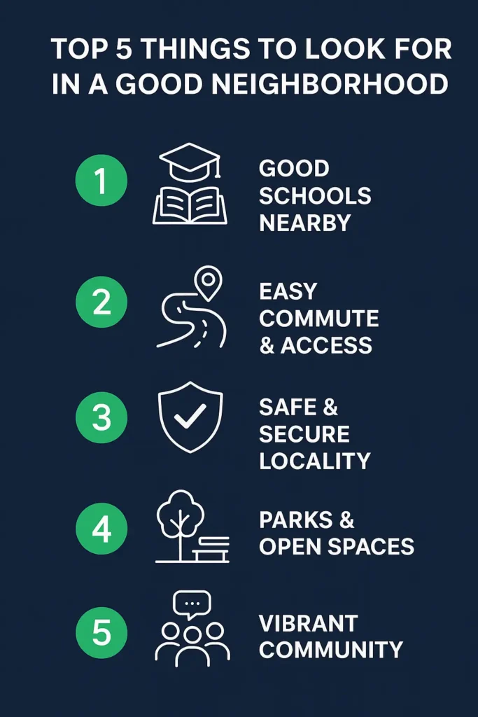 Buying a home? Discover the top 5 factors that define a good neighborhood โ€” schools, connectivity, safety, greenery, and social life โ€” before making your move.